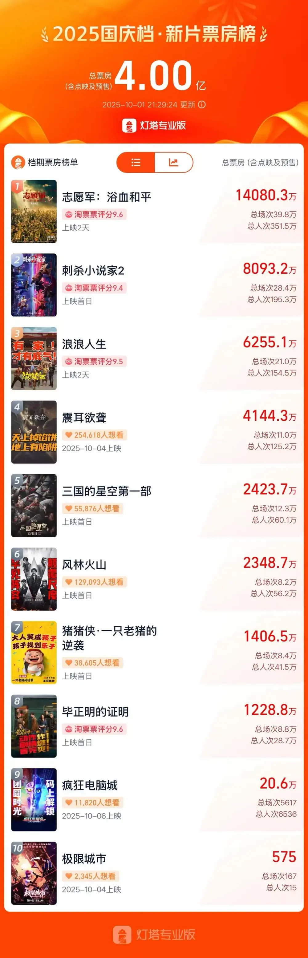 · 灯塔专业版多个方面数据显现,到10月1日21时29分,2025年国庆档新片票房榜(含预售)已打破4亿元,《志愿军:浴血平和》《刺杀小说家2》《浪浪人生》位列国庆档新片票房前三。